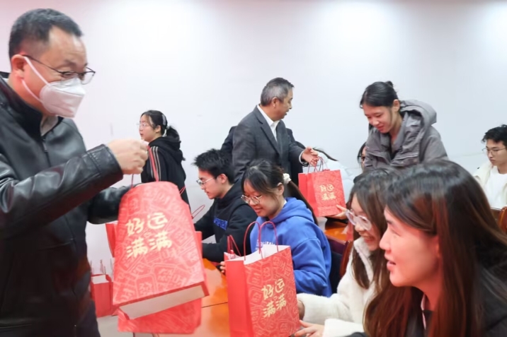 在最受期待的暖心礼包赠送环节上,学院领导与老师们亲手为每位考研学子送上了定制礼包。礼包内不仅有零食、暖贴、水果等实用物资,还配有精心设计的励志卡片,其中的橙子更是寓意“事‘橙’如意”,饱含着学院对学子们金榜题名的美好祝愿。接过礼包的学子们纷纷表示,这份温暖让他们感受到了学院的关怀,也让备考的脚步更加坚定。