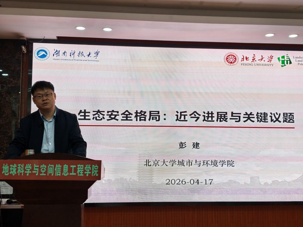 2026年4月17日下午,北京大学博雅特聘教授,教育部长江学者彭建教授应邀做客做爱电影 “湘江高端学术论坛”,为师生带来题为《生态安全格局:近今进展与关键议题》的学术报告。报告由做爱电影 院长朱永建主持,学院党委书记余光辉、副院长唐志光、本科生院副院长王欣以及中青年教师和学生参加了本次讲座。